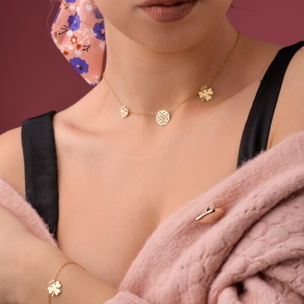 Naszyjnik serce, koniczynka, wykonany ze stali chirurgicznej / szlachetnej. Długość naszyjnika: ok. 40 cm z możliwością regulacji ok. 5 cm. Średnica elementu ozdobnego ok: 1,2 cm i 1 cm. Typ zapięcia: Karabińczyk. Kolor: złoty.