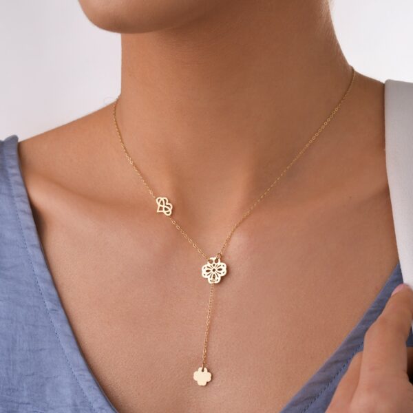 Naszyjnik krawatka, koniczynki, wykonany ze stali chirurgicznej / szlachetnej. Maksymalna długość naszyjnika: ok. 44 cm z możliwością regulacji ok. 5 cm. Średnica elementu ozdobnego: ok. 1,2 cm i 0,8 cm. Typ zapięcia: karabińczyk. Kolor: złoty.