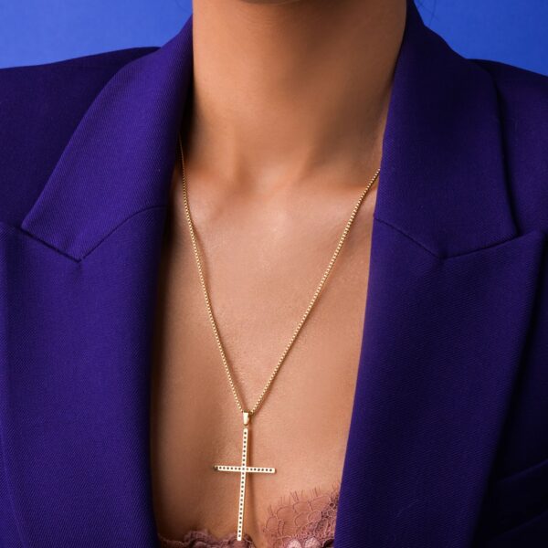 Naszyjnik krzyż wykonany ze stali chirurgicznej/szlachetnej oraz krysztalków . Długość całkowita naszyjnika: ok 55,5 cm z możliwością regulacji: ok. 5 cm. Wymiary krzyża: 5 cm x 3,2 cm. Typ zapięcia: karabińczyk. Kolor: złoty.