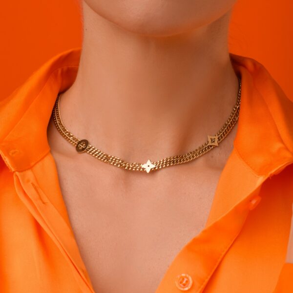 Naszyjnik lilie, koniczynka, wykonany ze stali chirurgicznej / szlachetnej. Długość naszyjnika: ok. 40 cm z możliwością regulacji ok. 5 cm. Szerokość naszyjnika: ok. 0,5 cm. Średnica koniczynki: ok. 1 cm. Rodzaj zapięcia: karabińczyk. Kolor: złoty.