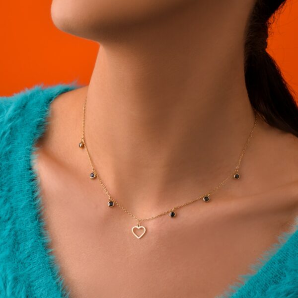 Naszyjnik serce, wykonany ze stali chirurgicznej / szlachetnej oraz szklanych kryształków. Długość naszyjnika: ok. 40 cm z możliwością regulacji ok. 5 cm. Średnica serca: 0,8 cm. Rodzaj zapięcia: karabińczyk. Kolor: złoty, czarny.