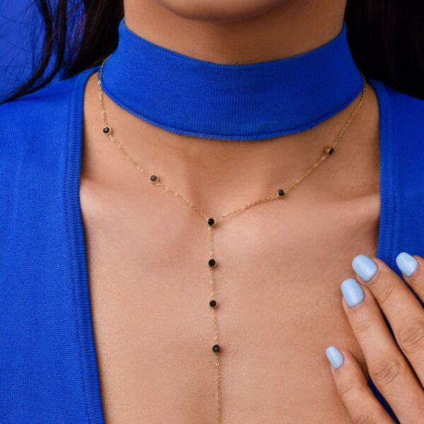 Naszyjnik krawatka, kryształki wykonany ze stali chirurgicznej / szlachetnej. Długość naszyjnika ok. 40 cm z możliwością regulacji ok 5 cm. Długość elementu ozdobnego ok. 10,5 cm. Typ zapięcia: karabińczyk. Kolor: złoty, czarny.