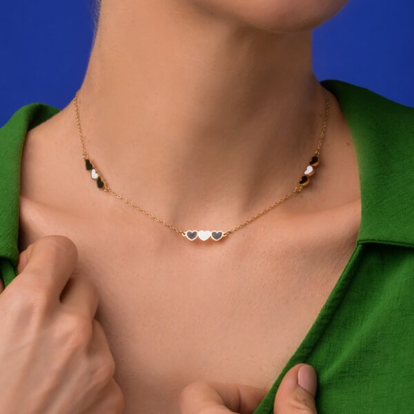 Naszyjnik malutkie serduszka, wykonany ze stali chirurgicznej / szlachetnej oraz emalii jubilerskiej. Długość naszyjnika: ok. 40 cm z możliwością regulacji ok. 5 cm. Typ zapięcia: Karabińczyk. Kolor: złoty.