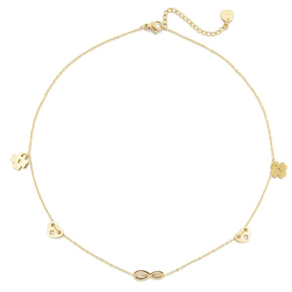 Naszyjnik serca, nieskończoność wykonany ze stali chirurgicznej / szlachetnej. Długość naszyjnika: ok.40 cm z możliwością regulacji ok. 5 cm.Wymiary elementu ozdobnego: ok.1,5 cm x 0,5 cm Rodzaj zapięcia: karabińczyk. Kolor: złoty.