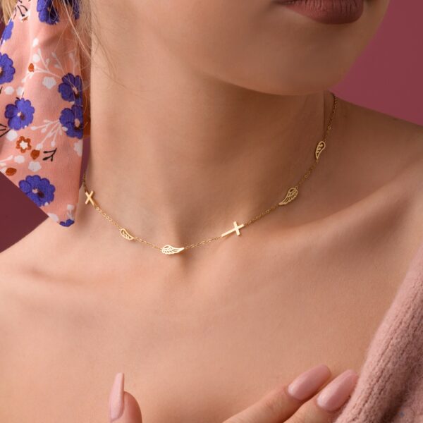 Naszyjnik skrzydełka, krzyzyki, wykonany ze stali chirurgicznej / szlachetnej. Długość naszyjnika: ok. 40 cm z możliwością regulacji ok. 5 cm. Rodzaj zapięcia: karabińczyk. Kolor: złoty.