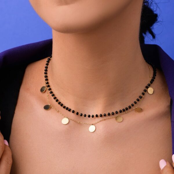 Naszyjnik podwójny,kółeczka wykonany ze stali chirurgicznej / szlachetnej oraz szklanych kryształków. Długość naszyjnika: krótki łańcuszek ok.39 cm, długi łańcuszek ok.40 cm z możliwością regulacji ok. Typ zapięcia: Karabińczyk. Kolor: złoty, czarny.