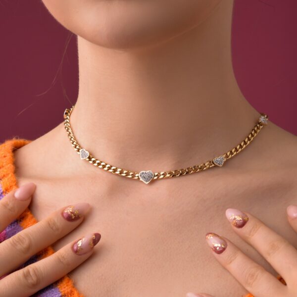 Naszyjnik łańcuch, serduszka, wykonany ze stali chirurgicznej / szlachetnej. Długość naszyjnika: ok. 40 cm z możliwością regulacji: 5 cm. Szerokość łańcuszka: 0,4 cm. Średnca elementu ozdobnego ok: 0,7 cm. Typ Zapięcia : karabińczyk. Kolor: złoty.