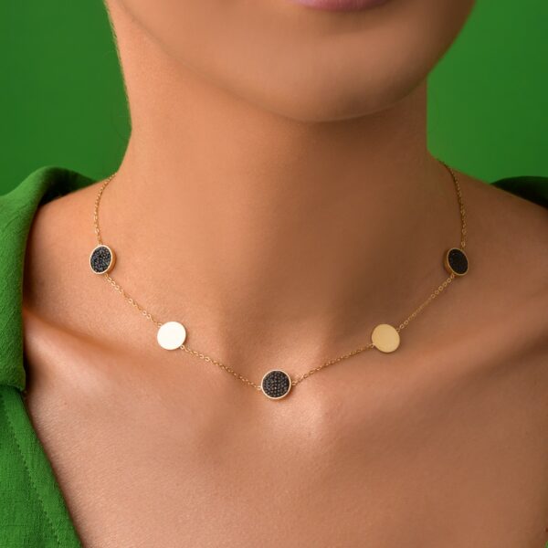 Naszyjnik czarne kółka, wykonany ze stali chirurgicznej / szlachetnej. Długość naszyjnika: ok. 41 cm z możliwością regulacji ok. 5 cm. Średnica elementu ozdobnego ok: 1 cm. Typ zapięcia: karabińczyk. Kolor: złoty, czarny.