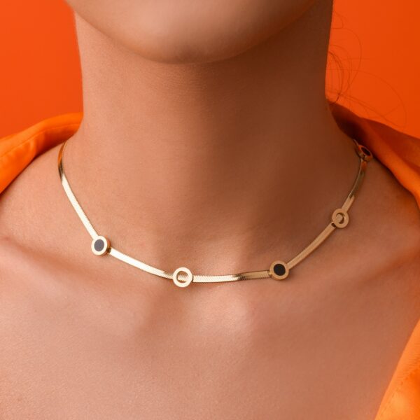Naszyjnik kółeczka, wykonany ze stali chirurgicznej / szlachetnej oraz emalii. Długość naszyjnika: ok. 40 cm z możliwością regulacji ok. 5 cm. Szerokość naszyjnika: ok. 0,3 cm. Średnica kółeczka: ok. 0,8 cm. Rodzaj zapięcia: karabińczyk. Kolor: złoty.