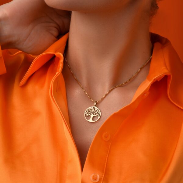 Naszyjnik drzewko, wykonany ze stali chirurgicznej / szlachetnej. Długość naszyjnika ok. 40 cm z możliwością regulacji ok. 5 cm. Średnica elementu ozdobnego: ok. 2 cm. Typ zapięcia: karabińczyk. Kolor: złoty.
