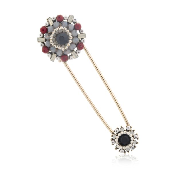 Elegancka broszka, agrafka, kwiatek, wykonana z metalu i szklanych kryształków. Rozmiar broszki: ok.7,5 cm x 2,4 cm. Kolor: szary. Broszka ta pięknie ozdobi twoje kreacje - czy to klasyczne czy minimalistyczne, w których będzie główną ozdobą.