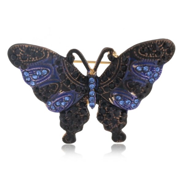 Piękna broszka w kształcie motylka, wykonana z metalu i szklanych kryształków. Rozmiar broszki: 3 cm x 4,5 cm. Kolor: złoty, granatowy. Broszka ta pięknie ozdobi twoje kreacje - czy to klasyczne czy minimalistyczne, w których będzie główną ozdobą.