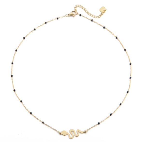 Naszyjnik wąż , wykonany ze stali chirurgicznej / szlachetnej oraz czarnej emalii. Długość naszyjnika: 40 cm z możliwością regulacji: 5 cm. Wymiary elementu ozdobnego: ok 2,1 cm x 0,9 cm. Typ zapięcia: karabińczyk. Kolor: złoty.