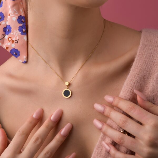 Naszyjnik kółko, wykonany ze stali chirurgicznej/szlachetnej i emalii. Długość naszyjnika: ok. 40 cm z możliwością regulacji ok. 5 cm. Średnica elementu ozdobnego: ok. 1,4 cm. Typ zapięcia: karabińczyk. Kolor: złoty, czarny.
