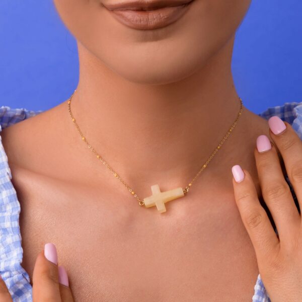 Naszyjnik CYTRYN, krzyż, wykonany ze stali chirurgicznej / szlachetnej oraz kamienia naturalnego cytrynu. Długość naszyjnika: 38 cm z możliwością regulacji: 7 cm. Wymiary elementu ozdobnego: 2,5 cm x 1,8 cm. Typ zapięcia: karabińczyk. Kolor: złoty.