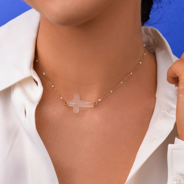 Naszyjnik KRYSZTAŁ GÓRSKI, krzyż, wykonany ze stali chirurgicznej / szlachetnej oraz kamienia naturalnego. Długość naszyjnika: 38 cm z możliwością regulacji: 7 cm. Wymiary elementu ozdobnego: 2,5 cm x 1,8 cm. Typ zapięcia: karabińczyk. Kolor: złoty.