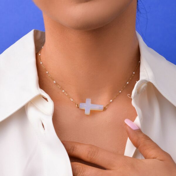 Naszyjnik OPAL, krzyż, wykonany ze stali chirurgicznej / szlachetnej oraz kamienia naturalnego opalu. Długość naszyjnika: ok. 38 cm z możliwością regulacji ok. 7 cm. Wymiary elementu ozdobnego: 2,5 cm x 1,8 cm. Typ zapięcia: karabińczyk. Kolor: złoty.