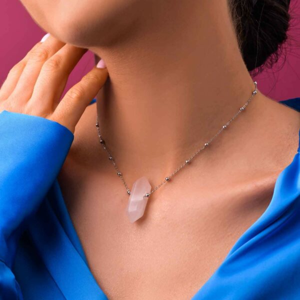 Naszyjnik KWARC RÓŻOWY, wykonany ze stali chirurgicznej / szlachetnej oraz kamienia naturalnego. Długość naszyjnika: 38 cm z możliwością regulacji: 7 cm. Wymiary elementu ozdobnego: 3,5 cm x 1,2 cm. Typ zapięcia: karabińczyk. Kolor: srebrny.