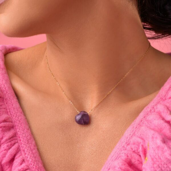 Naszyjnik AMETYST, wykonany ze stali chirurgicznej / szlachetnej oraz kamienia naturalnego ametystu. Długość naszyjnika: ok. 38 cm z możliwością regulacji ok. 7 cm. Średnica elementu ozdobnego: 1,5 cm. Typ zapięcia: karabińczyk. Kolor: złoty.