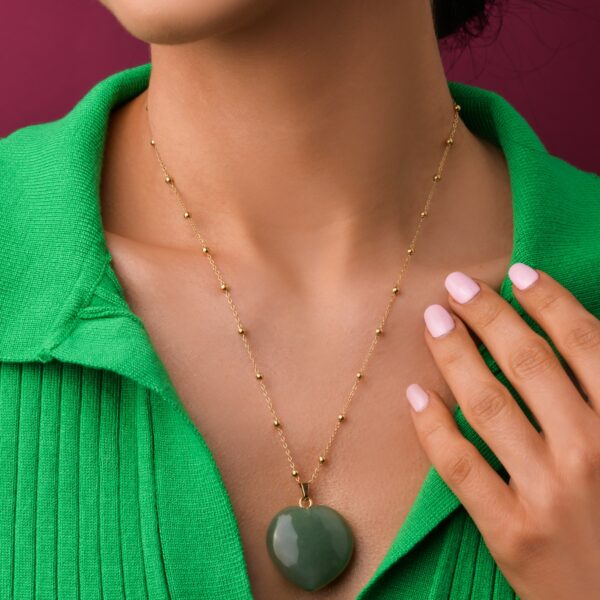 Naszyjnik AWENTURYN, serce, wykonany ze stali chirurgicznej / szlachetnej oraz kamienia naturalnego awenturynu. Długość naszyjnika: ok. 49 cm z możliwością regulacji ok. 7 cm. Średnica elementu ozdobnego: 3 cm. Typ zapięcia: karabińczyk. Kolor: złoty.