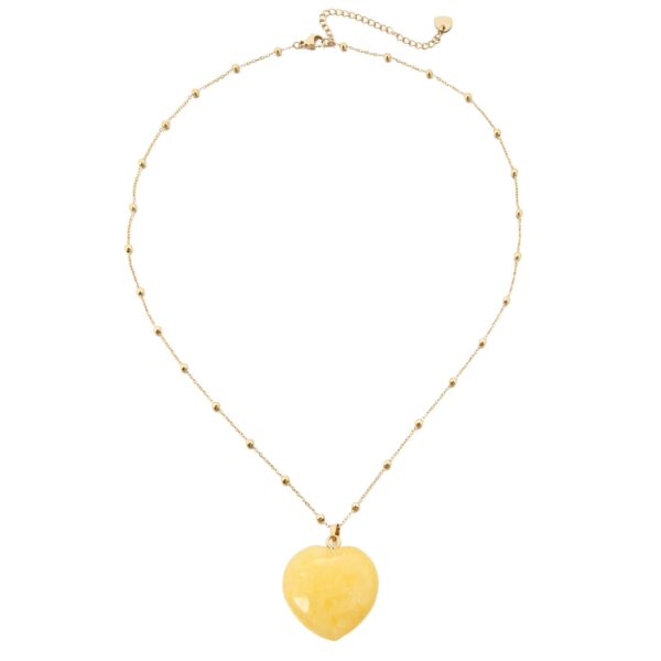 Naszyjnik CYTRYN, serce, wykonany ze stali chirurgicznej / szlachetnej oraz kamienia naturalnego cytrynu. Długość naszyjnika: ok. 49 cm z możliwością regulacji ok. 7 cm. Średnica elementu ozdobnego: 3 cm. Typ zapięcia: karabińczyk. Kolor: złoty.
