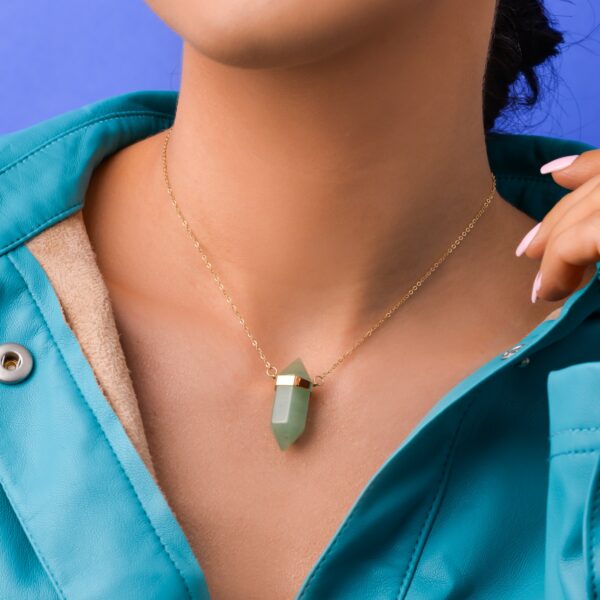 Naszyjnik AWENTURYN, wykonany ze stali chirurgicznej / szlachetnej oraz kamienia naturalnego awenturyn. Długość naszyjnika: 38 cm z możliwością regulacji: 7 cm. Wymiary elementu ozdobnego: 3 cm x 1,2 cm. Typ zapięcia: karabińczyk. Kolor: złoty.