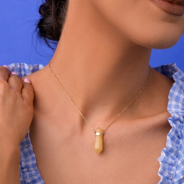 Naszyjnik CYTRYN, wykonany ze stali chirurgicznej / szlachetnej oraz kamienia naturalnego cytryn. Długość naszyjnika: 39 cm z możliwością regulacji: 7 cm. Wymiary elementu ozdobnego: 3 cm x 0,9 cm. Typ zapięcia: karabińczyk. Kolor: złoty.
