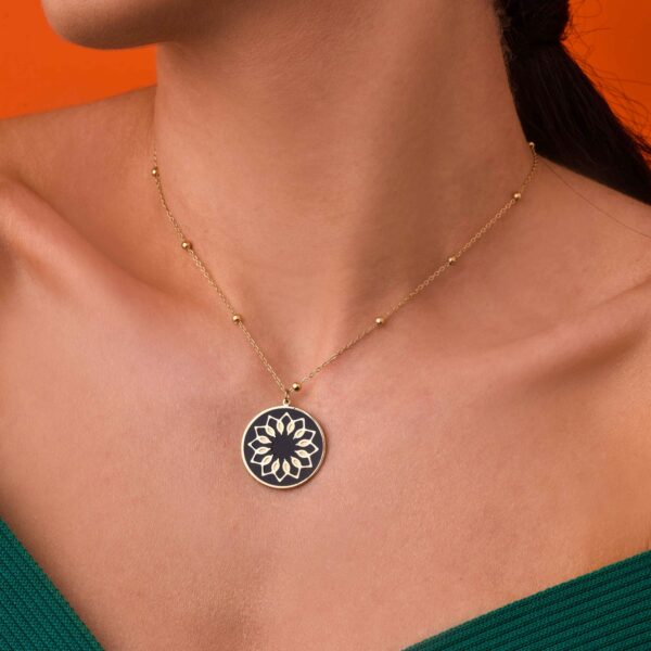 Naszyjnik kwiat, kuleczki, wykonany ze stali chirurgicznej / szlachetnej i emalii. Długość naszyjnika: ok.38 cm z możliwością regulacji ok. 7 cm. Średnica elementu ozdobnego: ok. 2,5 cm. Typ zapięcia: karabińczyk. Kolor: złoty, czarny.