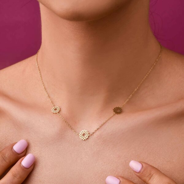Naszyjnik kwiatuszki, wykonany ze stali chirurgicznej / szlachetnej. Długość naszyjnika: ok. 40 cm z możliwością regulacji ok 5 cm. Średnica elementu ozdobnego: ok. 1 cm. Typ zapięcia: karabińczyk. Kolor: złoty.