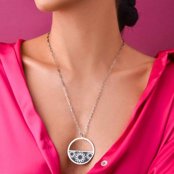 Długi naszyjnik kwiaty, wykonany ze stali chirurgicznej / szlachetnej i emalii. Długość naszyjnika: ok. 55 cm z możliwością regulacji ok. 7 cm. Średnica elementu ozdobnego: ok. 4 cm. Typ zapięcia: karabińczyk. Kolor: srebrny, czarny.