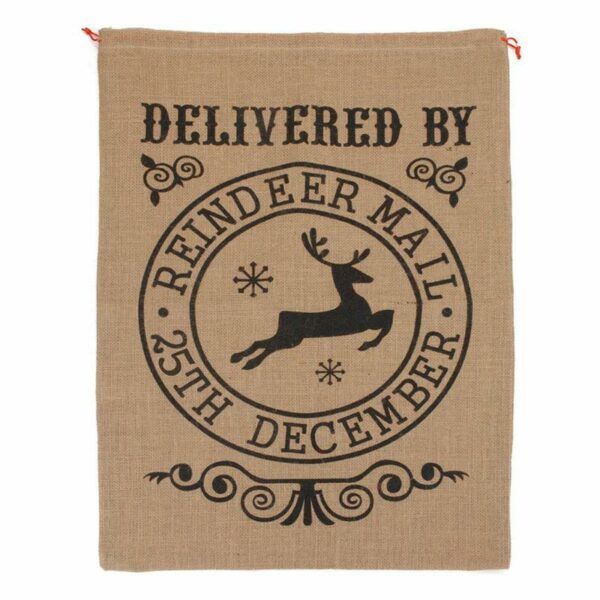 Torba jutowa na prezenty od św. Mikołaja z wiązaniem i świątecznym motywem o wymiarach 72x50 cm