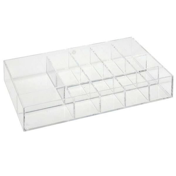 Wykonany z przeźroczystego tworzywa z ruchomymi, wyjmowanymi ściankami o wymiarach: 33x20,5x5,5 cm