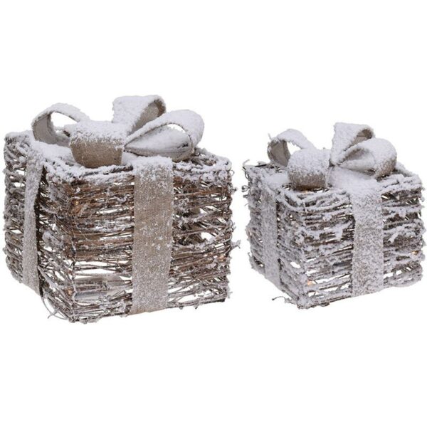 Dekoracja świąteczna Bożonarodzeniowa w formie kompletu pudełek na prezenty do postawienia pod choinką czy kominkiem wykonana z rattanu z lampkami led