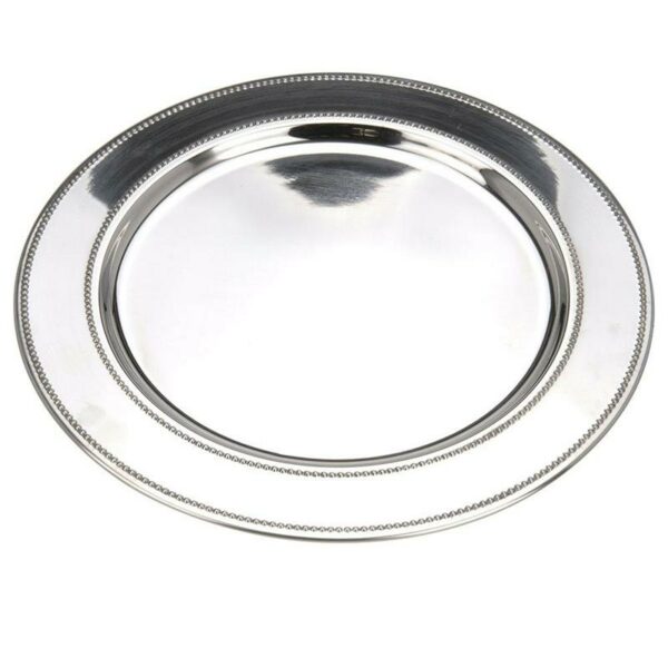 Wykonany z metalu talerz, podstawek, w kolorze srebrnym o średnicy 33 cm