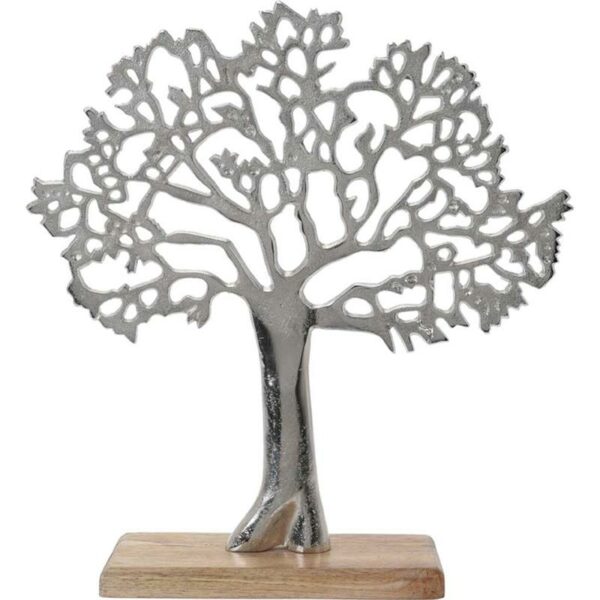 Nowoczesna dekoracja stojąca w kształcie drzewka, wykonana z aluminium w kolorze srebra na drewnianej podstawie o wymiarach: 33x31x8 cm