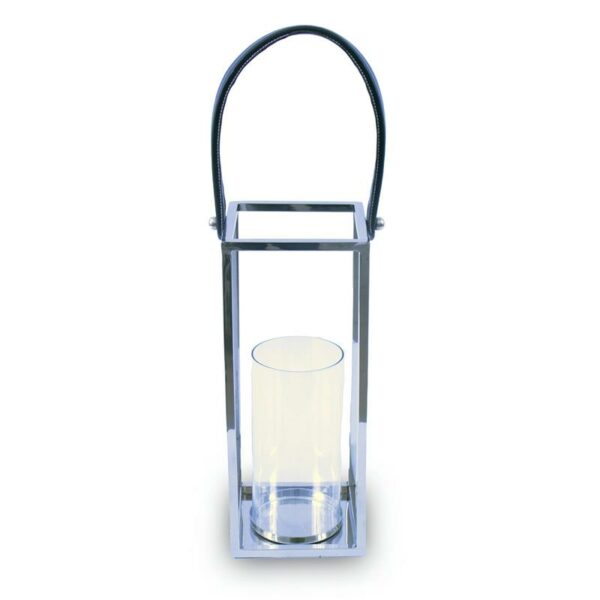 Srebrny dekoracyjny lampionik w nowoczesnym stylu z serii Premium wykonany z najwyższej jakości stali nierdzewnej oraz szkła