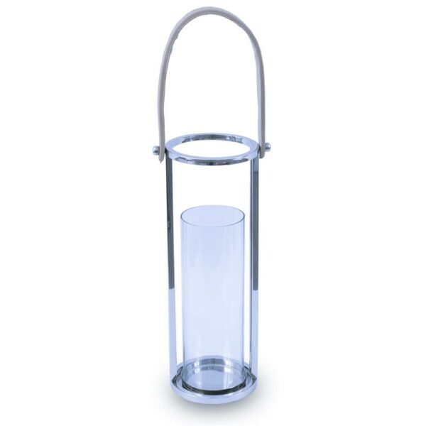 Srebrny dekoracyjny lampionik w nowoczesnym stylu z serii Premium wykonany z najwyższej jakości stali nierdzewnej oraz szkła