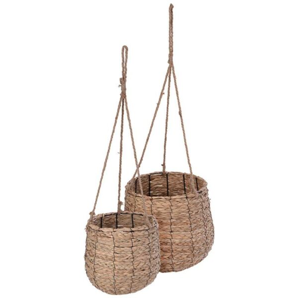 Komplet 2 szt kwietników wiszących na sznurze z donicą wykonanych z trawy morskiej w naturalnym beżowym kolorze w stylu Boho