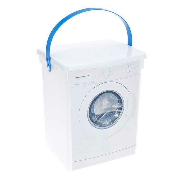 Pojemnik łazienkowy w kształcie pralki do przechowywania proszku i kapsułek do prania, zamykany, z rączką do przenoszenia o pojemności 5L, wymiary: 23,5x18,5x19,5 cm