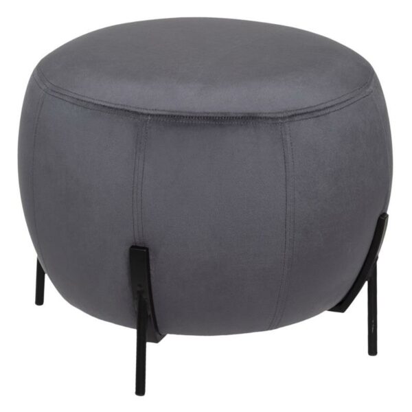 Siedzisko wykonane z miękkiego i przyjemnego w dotyku materiału w kolorze szarym, metalowa podstawa, funkcjonalny i stylowy dodatek do salonu