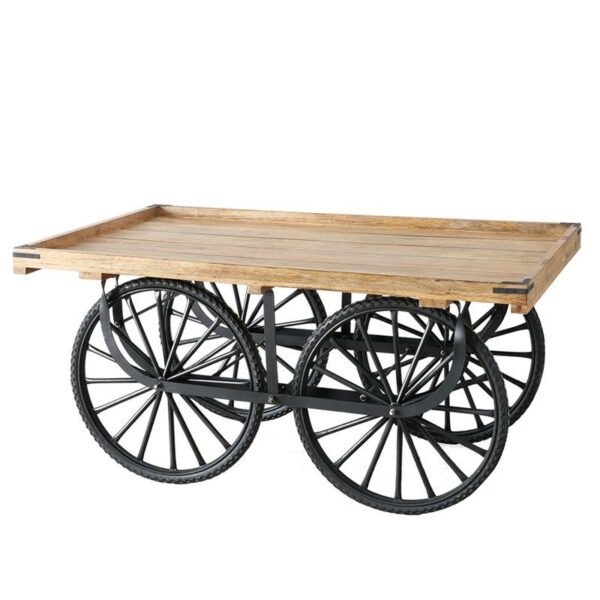 Podstawa wykonana z metalu w kolorze czarnym, blat z drewna mango w naturalnym odcieniu, oryginalny i ekskluzywny design