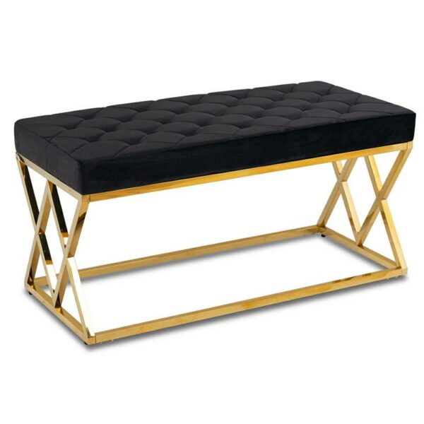 Pufa w stylu glamour, rama wykonana ze stali w kolorze złotym, pikowane siedzisko w kolorze czarnym o szerokości 97 cm
