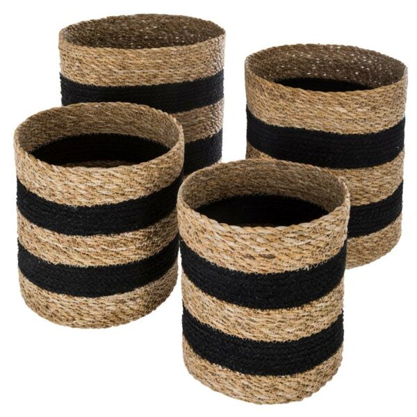 Okrągły kształt, 4 kosze o różnej wysokości i średnicy w zestawie, naturalna kolorystka z dodatkiem czerni