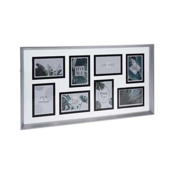 Multiramka ścienna na 8 fotografii, wykonana ze szkła oraz mdf, w eleganckim szaro-srebrnym kolorze o wymiarach: 70x38,5 cm