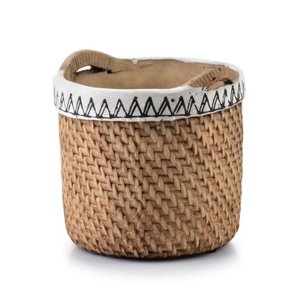 W kolorze naturalnego brązu, ozdobiona wzorem imitującym splot wikliny, idealny dodatek do wnętrz urządzonych w stylu boho lub rustykalnym