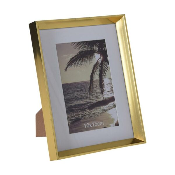 Prosta, klasyczna ramka na zdjęcia wykonana z tworzywa w kolorze złotym, w nowoczesnym designie o wymiarach całkowitych: 21,4x16,6 cm