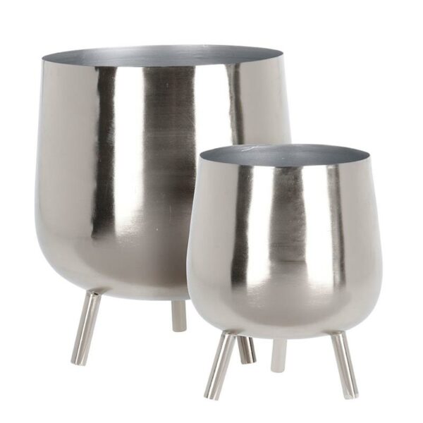 Komplet kwietników metalowych z donicą, donice na nóżkach w kolorze srebrnym w stylu glamour o wymiarach: 24x21; 19x15,5 cm