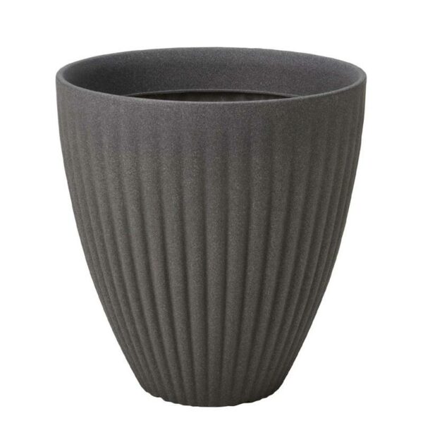 Nowoczesna, prążkowana, okrągła osłonka na kwiaty wykonana z mocnego tworzywa imitującego kamień o wysokości 42 cm, średnica 40 cm