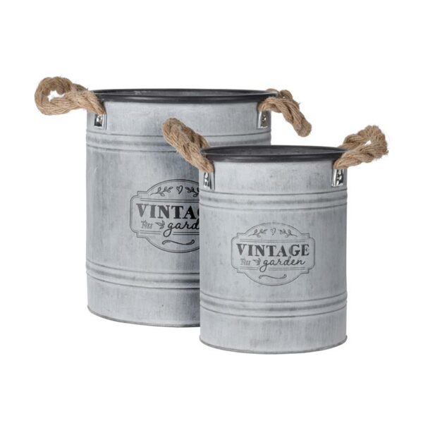 Wykonane z metalu, cynkowe osłonki, wiaderka na kwiaty do ogrodu z wygodnymi uchwytami ze sznura, komplet 2 szt o wymiarach: 22,5x25 cm; 18,5x21,5 cm