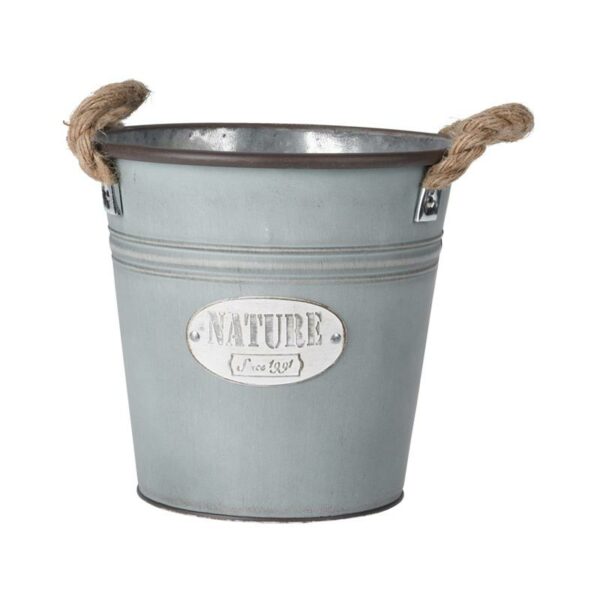Wykonana z metalu, cynkowa osłonka w kształcie wiaderka na kwiaty, z uchwytami ze sznura o wymiarach: 21,5x20,5 cm